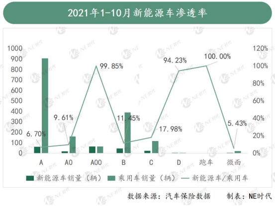 據(jù)汽車保險數(shù)據(jù)顯示,目前整個乘用車市場以AB、A0、CA00級車為主。 以今年前十個月的銷量來看,這些主流級別車型中,新能源車滲透率最高的還是A00級車型,其他級別車型的電動化替代空間基本都在90%以上。A級車作為乘用車市場體量最大的一部分,也是目前電動化轉型壓力最大的一個市場。