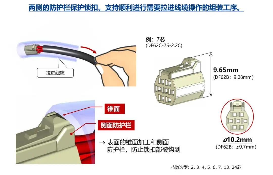 特點(diǎn) [SignalBee?] 2 x 2.2 mm間距 用于狹小空間纖細(xì)型中繼連接器(UL C-UL認(rèn)證產(chǎn)品) 1. 纖細(xì)光滑的外形適合狹窄空間的布線 2. 清晰的鎖扣感和目視可確認(rèn)是否鎖定 3. 可靠的接觸結(jié)構(gòu) 4. 堅(jiān)固的端子結(jié)構(gòu) 5. 芯數(shù)選型:2、3、4、5、6、7、13、24 DF62B:標(biāo)準(zhǔn)型 DF62C:鎖加部保護(hù)強(qiáng)化型 DF62P:面板安裝型 6. 可與DF11/DF59系列共用自動(dòng)壓著設(shè)備 7. 防冷凝措施(防水型DF62W) 細(xì)小